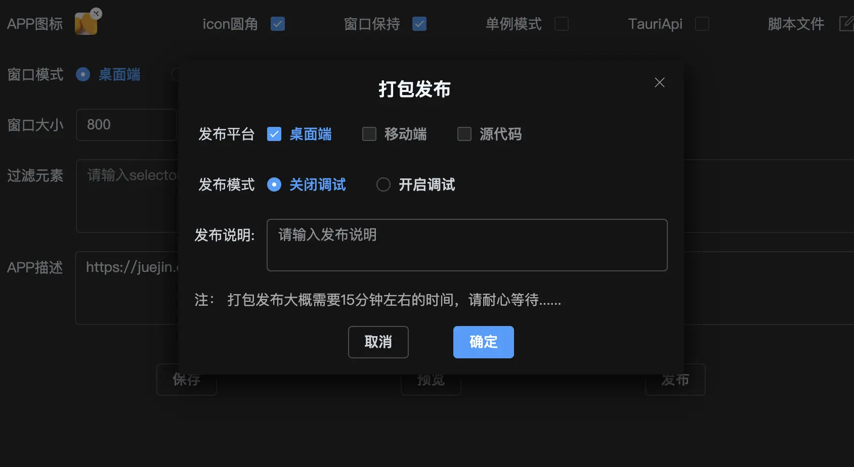 You may optionally add release notes describing the changes in this version. After finalizing all configurations, click "Confirm" to begin the packaging process. The compilation typically takes about 10 minutes to complete...