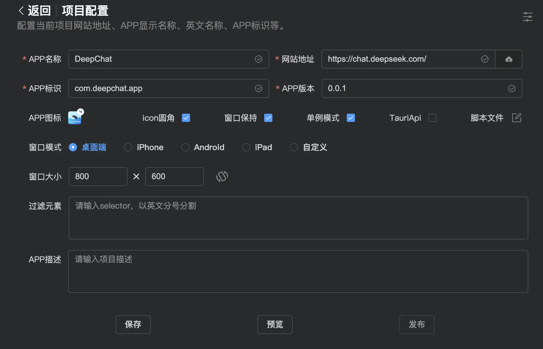 After basic configuration, click the Preview button to see how your app will look. If everything is correct, click Publish to start packaging.