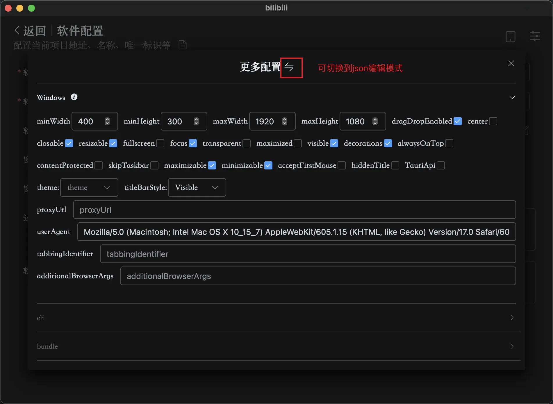 配置项说明(最终以 tauri2 官方为准),切换到 json 模式可以增删改更多可编辑属性。